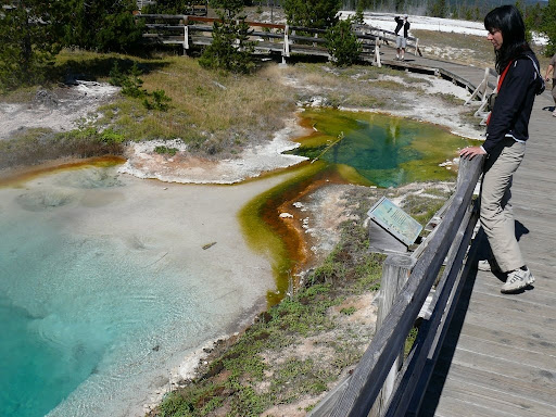 Das Gebiet des West Thumb Geysirbeckens und des Potts Bassin im Norden, ist das grösste Geysirbecken am Ufer des Yellowstone Lakes. Dieses Geysirbecken hat uns am besten gefallen, durch den See kamen die farblichen Pools schön zur Geltung. Deshalb auch die vielen Fotos.