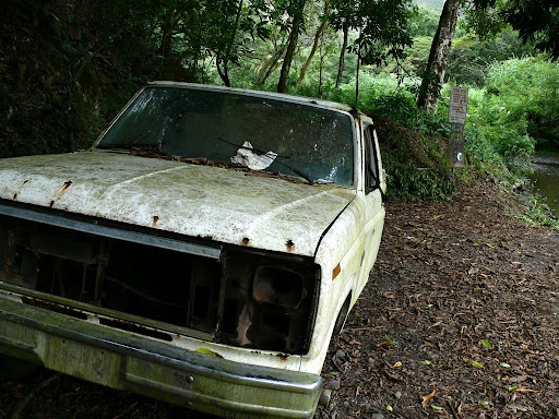 Da war ich vielleicht froh, dass wir es noch vor dem Sturzbach geschafft hatten. Da wir für die Wanderung im Waipio länger brauchten wie erst geplant, hatten wir dann auf dem Nachhauseweg nach Volcano nicht mehr viel Zeit noch was anderes anzusehen. Immerhin konnten wir dann noch die Akaka Falls im Regen besichtigen.