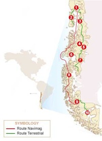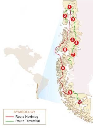1.- Puerto Montt 2.- Castro 3.- Chaitén 4.- Puerto Chacabuco 5.- Coihaique 6.- Laguna San Rafael 7.- Cochrane 8.- Puerto Edén 9.- Puerto Natales 10.- Punta Arenas |