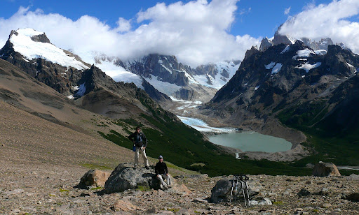 Wir hatten von oben eine tolle Sicht auf die Laguna Torre, den Cerro Solo, den Flitz Roy und seinen Kollegen und die dahinter liegenden Gletscher (rückblickend auf unseren ersten Tag). Nur der Cerro Torre wollte nach wie vor nicht… er blieb für uns weiterhin in den Wolken versteckt.